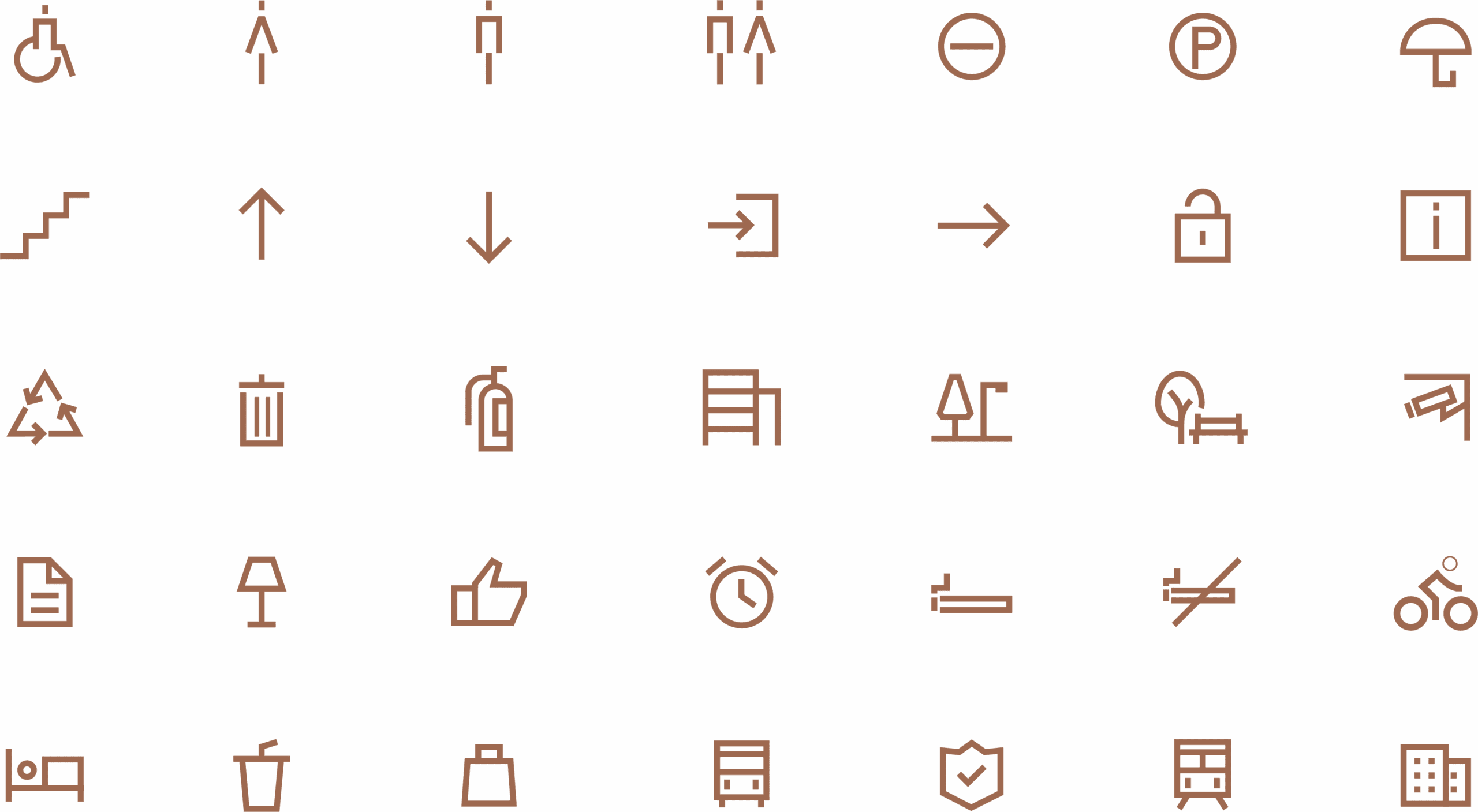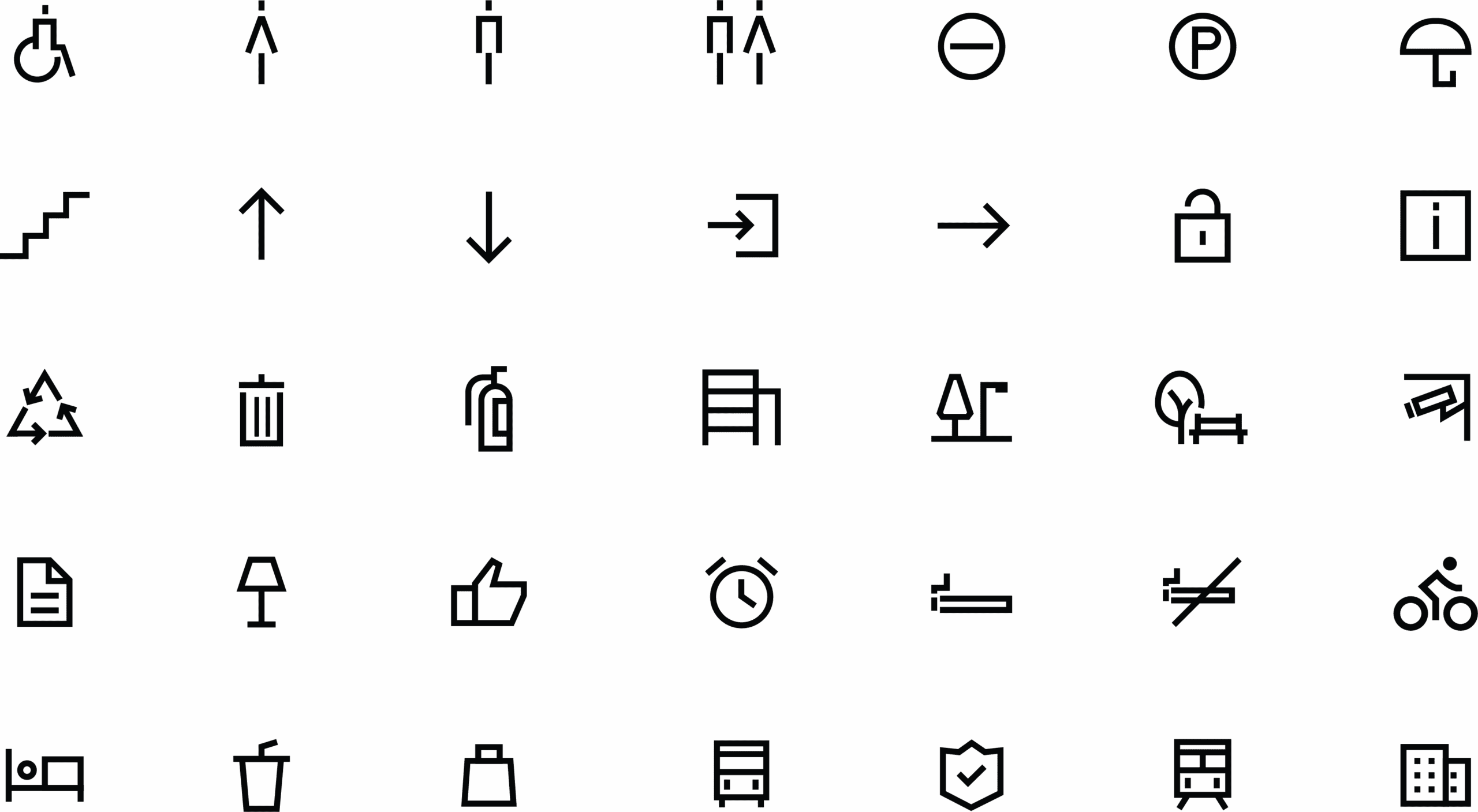The monochromatic color scheme, typically black on white, enhances visibility and versatility across various applications. Designed for clarity and functionality, these icons effectively convey essential information and services, such as accessibility, navigation, amenities, public utilities, safety, and leisure activities. Ideal for urban development projects, the icons not only serve practical purposes but also contribute to a cohesive and aesthetically pleasing visual environment.